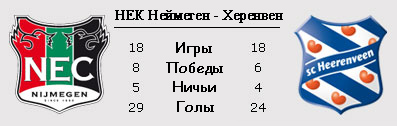 | Статистика встреч: 12-8-17 (53:67) | | Сезон 2011/2012 | | 06.08.2011 Херенвен - НЕК Неймеген - 2:2 | | | | Сезон 2010/2011 | | 05.02.2011 Херенвен - НЕК Неймеген - 0:0 | | 28.08.2010 НЕК Неймеген - Херенвен - 2:2 | | | | Сезон 2009/2010 | | 19.03.2010 Херенвен - НЕК Неймеген - 4:1 | | 07.08.2009 НЕК Неймеген - Херенвен - 4:1 | | | | Сезон 2008/2009 | | 15.02.2009 НЕК Неймеген - Херенвен - 1:1 | | 21.09.2008 Херенвен - НЕК Неймеген - 2:1 | | | | Сезон 2007/2008 | | 24.02.2008 Херенвен - НЕК Неймеген - 2:3 | | 02.12.2007 НЕК Неймеген - Херенвен - 0:1 | | | | Сезон 2006/2007 | | 27.12.2006 НЕК Неймеген - Херенвен - 0:2 | | 17.09.2006 Херенвен - НЕК Неймеген - 3:0 | |
