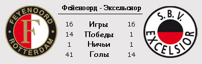Роттердамское дерби! И пусть силы команд не равны и сами коллективы находятся на разных полюсах турнирной таблицы, накал от этого не должен измениться. "Фейеноорд" в прошлом туре сыграл вничью с "Родой", причём ничья оказалась нулевой. Такого результата у "Фейе" не было два года. Последняя нулевая ничья была зафиксирована 11 апреля 2010 года в матче с ПСВ. Впрочем, даже одного очка в прошлом туре команде Рональда Кумана хватило для того, чтобы подняться в таблице на одно место, поскольку ПСВ и "Херенвен" свои матчи проиграли. "Эксельсиор" же по итогам прошлого тура спустился на последнее место, потому что главный конкурент команды "Де Графсхап" весьма неожиданно с крупным счётом одолел "Утрехт". Наряду с "Венло", "Эксельсиор" меньше всех очков набрал на вызде, всего три. На поле "Фейеноорда" команде Джона Ламмерса удавалось выиграть лишь единожды, и то это было 32 (!) года назад (2 марта 1980 года, 0:4). Фаворит в этом матче очевиден и малому роттердамскому коллективу остаётся надеяться на удачу, которая ой-как пригодится.
