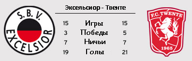 | Статистика встреч: 5-10-16 (30:53) | | Сезон 2011/2012 | | 02.10.2011 Твенте - Эксельсиор - 2:2 | | | | Сезон 2010/2011 | | 20.03.2011 Эксельсиор - Твенте - 0:2 | | 06.11.2010 Твенте - Эксельсиор - 2:1 | | | | Сезон 2007/2008 | | 05.04.2008 Твенте - Эксельсиор - 1:0 | | 18.08.2007 Эксельсиор - Твенте - 0:2 | | | | Сезон 2006/2007 | | 03.02.2007 Эксельсиор - Твенте - 1:2 | | 21.10.2006 Твенте - Эксельсиор - 4:1 | |