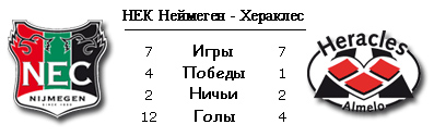 Если бы этот матч проходил на стадионе "Полман", то выделить в нем фаворита было бы плевым делом. Однако, впервые за два тура, "Хераклесу" придется выбраться из уютного гнездышка и навестить не самого гостеприимного хозяина. Можно не сомневаться, что перед своими болельщиками НЕК покажет, что крупное поражение от АЗ было отнюдь не показателем реальной силы команды. "Хераклес", в свою очередь, постарается не упасть лицом в грязь и продолжить беспроигрышную серию. Эта игра будет интересна тем, что обе команды в начале сезона демонстрируют почти совершенно равную игру. Между ними лишь одно очко разницы, и они расположились в середине таблицы ближе к верхней её части. Однако, "Хераклес" для НЕКа - неудобная команда. Уже семь встреч кряду не могут неймегенцы победить клуб из Альмело. В прошлом сезоне одна игра стала ничейной, а в другой победил "Хераклес".