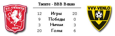 | Статистика встреч: 19-10-7 (52:31) | | Сезон 2010/2011 | | 13.03.2011 Твенте - ВВВ Венло - 2:1 | | 11.09.2010 ВВВ Венло - Твенте - 1:2 | | | | Сезон 2009/2010 | | 03.04.2010 ВВВ Венло - Твенте - 0:2 | | 26.09.2009 Твенте - ВВВ Венло - 2:1 | | | | Сезон 2007/2008 | | 11.03.2008 ВВВ Венло - Твенте - 0:2 | | 15.12.2007 Твенте - ВВВ Венло - 1:1 | |