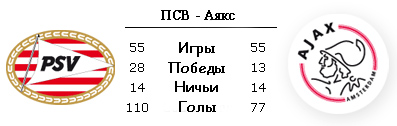 | Статистика встреч: 47-22-41 (187:182) | | Сезон 2010/2011 | | 27.02.2011 ПСВ Эйндховен - Аякс - 0:0 | | 20.11.2010 Аякс - ПСВ Эйндховен - 0:0 | | | | Сезон 2009/2010 | | 14.03.2010 Аякс - ПСВ Эйндховен - 4:1 | | 16.08.2009 ПСВ Эйндховен - Аякс - 4:3 | | | | Сезон 2008/2009 | | 19.04.2009 ПСВ Эйндховен - Аякс - 6:2 | | 16.11.2008 Аякс - ПСВ Эйндховен - 4:1 | | | | Сезон 2007/2008 | | 19.03.2008 ПСВ Эйндховен - Аякс - 0:0 | | 30.01.2008 Аякс - ПСВ Эйндховен - 0:2 | | | | Сезон 2006/2007 | | 18.03.2007 ПСВ Эйндховен - Аякс - 1:5 | | 12.11.2006 Аякс - ПСВ Эйндховен - 0:1 | |