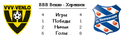 | Статистика встреч: 1-3-4 (8:17) | | Сезон 2010/2011 | | 23.04.2011 ВВВ Венло - Херенвен - 2:2 | | 23.10.2010 Херенвен - ВВВ Венло - 2:0 | | | | Сезон 2009/2010 | | 02.02.2010 ВВВ Венло - Херенвен - 3:1 | | 04.10.2009 Херенвен - ВВВ Венло - 1:1 | | | | Сезон 2007/2008 | | 23.01.2008 Херенвен - ВВВ Венло - 5:1 | | 27.10.2007 ВВВ Венло - Херенвен - 0:4 | |