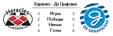 "Хераклес" в этом сезоне лишь один раз сумел победить на своём поле, хотя по идее, эта команда является домашней. Единственная победа была одержана в далёком втором туре над НАК Бредой. С другой стороны в двух других поединках подопечным Петера Боша противостояли серьёзные клубы ("Фейеноорд" - 1:1 и "Аякс" - 2:3). К слову, победа над "Бредой" это вообще единственная победа у "гераклов" после семи туров, которые идут в середине таблицы. У "Де Графсхапа" дела и того хуже, хотя также в копилке есть одна победа над НЕКом. На выезде "суперфермеры" имеют очень плохую статистику. Уже десять последовательных выездов не приносят команде побед. Последняя гостевая победа датирована 22 января 2011 года, тогда со счётом 1:0 удалось обыграть "Фейеноорд". Интересно, что "Де Графсхап" ещё ни разу не выигрывал на поле "Хераклеса".