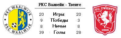 Имя соперника - это не всегда и есть соперник. С этим каламбуром "Твенте" очень тесно познакомился в прошлом туре, когда банально недооценил "Эксельсиор". Плата за это была высокой - минус два очка и отрыв АЗ. Теперь же энсхедцы повторить такой ошибки не должны, да и противник у них, прямо скажем, не из простых. "Валвейк" стал одним из открытий старта сезона, и хотя в последних турах результаты команды Рууда Бруда немного ухудшились, она еще вряд ли растеряла боевой дух, благодаря чему может создать немало проблем вице-чемпиону, которому всегда нелегко играть в "Валвейке". Правда у РКС есть значительные потери, в лице центрального защитника Рамоса, а, самое главное, принять участия в матче не сможет один из двух основных форвардов Джеффри Кастилльон, удалённый в прошлом туре. У "Твенте" же другая проблема. Два основных кипера получили травмы, а посему дебютирует совсем юный Ник Марсман.