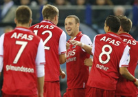 После классического противостояния "Фейеноорда" с "Аяксом", следующим по важности матчем тура, безусловно, была встреча в Арнеме "Витесса" и АЗ. Для обеих команд этот матч был одинаково важен. "Витессу" - с точки зрения подтверждения своих амбиций, как клуба, способного вести борьбу с признанными фаворитами первенства. АЗ, напротив, нужно было доказать, прежде всего, самим себе, что команда не развалилась после последних неудач и способна увидеть свет в конце тоннеля. Добыть в такой ситуации победу на поле соперника, не проигравшего ещё ни одного матча в сезоне, было бы отличным стимулом. То, что результат давит на участников матча, было заметно с первых минут. Команды чрезмерно осторожничали, и игра велась преимущественно в центре поля. Тем не менее, АЗ показал, насколько разной командой является, когда на поле присутствуют Махер и Алтидор, и когда они не могут играть. Именно американский форвард был одним из тех, кто имел шанс распечатать Вельтхайзена, но ни ему, ни Гудмундссону с Гортером это не удалось. Гораздо более удачливым оказался Рой Беренс, который перед перерывом открыл счет в матче после передачи Гортера. Пропустив, "Витесс" немного "поплыл", в результате чего гости до перерыва имели еще парочку моментов для взятия ворот, но простили арнемцев, позволив тем продержаться до перерыва, который явно пошел на пользу команде Фреда Рюттена. Со старта второго тайма на поле появился Ибарра, который мгновенно добавил хозяевам скорости в атаке, и моменты стали возникать уже у ворот Эстебана. В одном-двух он выручил, однако был бессилен против выскочившего на него ван Гинкеля, которому ассистировал Какюта. Естественно, получив шанс вырвать даже победу, хозяева не стали останавливаться на достигнутом, но успеха у чужих ворот больше не добились. Вместо этого, "Витесс" получил гол в свои. Гудмундссон великолепным ударом лишил арнемцев очков и нанес им первое поражение в сезоне. "Подарки" от календаря для "Витесса" на этом не заканчиваются. По итогам следующих двух туров можно прилично отскочить в таблице, ведь сыграть предстоит с "Аяксом" и "Твенте", где потерь очков вряд ли удастся избежать.