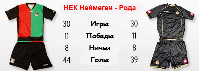 НЕК в этом сезоне показывает добротный футбол, а потому не случайно располагается за основными командами Эре. В прошлом туре "Неймеген" сумел одолеть кризисный АЗ, тем самым прервав свою неудачную серию в матчах с лидерами и грандами голландского футбола. До этого НЕК непременно проигрывал им. Впрочем, это в большей степени заслуга не самого НЕКа, а АЗ, который явно сейчас на спаде. Матч команды Пастора с "Родой" будет вдвойне интересен потому, что керкрадцы сейчас выходят из кризиса. После серии провальных матчей последовала крупная победа над "Венло", а затем "Гордость Юга" сумела отнять очки у лидера чемпионата "Твенте" (1:1). Пока что подопечные Бруда располагаются внизу таблицы. Чтобы поправить своё положение необходимо стабильно набирать очки, иначе можно так и болтаться внизу. В прошлом сезоне дважды победу одержали именно керкрадцы, а НЕК выигрывал в позапрошлом, причём с крупным счётом 5:0 и как раз на родной арене.