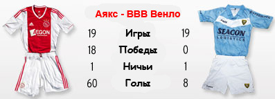 | Статистика встреч: 26-7-5 (94:33) | | Сезон 2011/2012 | | 02.05.2012 Аякс - ВВВ Венло - 2:0 | | 21.08.2011 ВВВ Венло - Аякс - 2:2 | | | | Сезон 2010/2011 | | 20.02.2011 Аякс - ВВВ Венло - 1:0 | | 28.11.2010 ВВВ Венло - Аякс - 0:2 | | | | Сезон 2009/2010 | | 11.04.2010 Аякс - ВВВ Венло - 7:0 | | 20.09.2009 ВВВ Венло - Аякс - 0:4 | | | | Сезон 2007/2008 | | 30.12.2007 ВВВ Венло - Аякс - 2:2 | | 30.09.2007 Аякс - ВВВ Венло - 6:1 | |