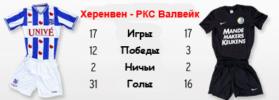 Коллективу Марка ван Бастена пока что не хватает стабильности, чему вряд ли стоит удивляться. Ведь Марко создаёт команду практически с нуля. Уже можно увидеть руку тренера, но работы в этом молодом коллективе ещё не початый край. В последних матчах "фризов" кидает из стороны в сторону, речь конечно о их результатах. Победы чередуются с поражениями. Вначале был в "Северном дерби" бит "Гронинген", затем последовало неожиданное и болезненное поражение от "Хераклеса", при шести (!) пропущенных мячах. Затем вновь победа, над "Зволле", а в прошлом туре снова крупное поражение от ПСВ 5:1. "Фризы" действительно сейчас очень непредсказуемы и что ждать от них в отчётном матче, сказать трудно. Естественно будут играть на победу, но что получится? "Валвейк" в прошлом туре одержал очень нужную победу, прервав тем самым свою затянувшуюся неудачную серию. Причём холодным душем коллектив Эрвина Кумана окатил не кого-нибудь, а "Утрехт", который метит в еврокубковую зону. Матч с "Херенвеном" должен дать ответ, это был локальный успех или же будет открыта новая серия, ведь старт в сезоне у РКС можно назвать успешным. С учётом того, что "Херенвен" много пропускает, рискнём предположить боевую ничью.