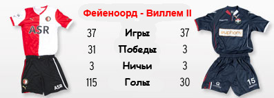 "Фейеноорду" предстоит сыграть с главным аутсайдером Эре "Виллемом". Команда Рональда Кумана после боевой ничьей с "Аяксом" и крупного поражения от "Твенте" реабилитировалась, обыграв "Роду". Свою победу уже одержал амстердамский "Аякс" и чтобы не отстать от врагов, "Фейе" тоже надо побеждать, тем более соперник самый удобный для этого. Тилбуржцы осели на самое дно очень резко. Всё дело в том, что ВВВ Венло умудрился одержать две победы кряду, ранее не имея в активе ни одного выигрыша. В итоге, у ВВВ стало девять очков, а у "Виллема" всего шесть. "Триколор" рискуют завершить первый круг в статусе главного аутсайдера и, видимо, так произойдёт, поскольку в оставшихся турах предстоят очень непростые матчи. "Фейеноорду" будет очень трудно повторить успех прошлого сезона, а именно второе место, однако оказаться в зоне еврокубков роттердамцам под силу.