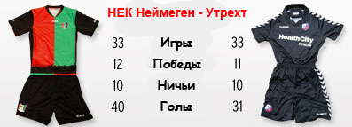 Из-за еврокубковых баталий субботняя программа тура состоит из матчей, в которых принимают участие середняки и аутсайдерами. Среди остальных поединков - это противостояние может считаться самым интересным, по крайней мере по вывеске. НЕК в прошлом туре крупно уступил "Витессу" и сейчас идёт на восьмой строчке. "Утрехт" тоже играл с одним из лидеров, а именно с "Твенте", но в отличии от сегодняшнего соперника, в том матче не уступил (1:1). Да и вообще в этом сезоне "Утрехт" довольно успешно играет с лидерами и не даром находится за их спинами с 22 очками. Зато "Неймеген" может похвастаться хорошей серией домашних матчей, где последнее поражение было датировано аж августом месяцем. Подопечные Пастора уступили тогда "Твенте" (1:3), который сносил всех со своего пути. После этого было три ничьи и победа над "Хераклесом". В случае сегодняшней победы "Неймеген" догонит "Утрехт" по количеству очков, а значит команда Пастора будет серьёзно настроена на эту игру, другое дело, что сразу несколько основных футболистов не помогут сегодня НЕКу. Напомним, что в прошлом туре в дерби с "Витессом" в составе НЕКа было аж три удаления. Три года уже на своём поле "Неймеген" не проигрывает "Утрехту", продолжится ли эта статистика?