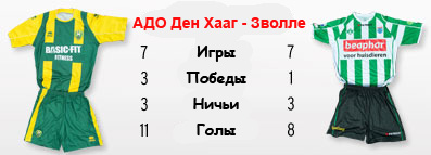 | Статистика встреч: 4-6-4 (19:20) | | Сезон 2003/2004 | | 26.03.2004 АДО Ден Хааг - Зволле - 1:1 | | 19.10.2003 Зволле - АДО Ден Хааг - 1:2 | |
