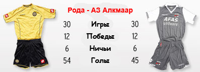 | Статистика встреч: 19-16-28 (92:103) | | Сезон 2012/2013 | | 16.09.2012 АЗ Алкмаар - Рода - 4:0 | | | | Сезон 2011/2012 | | 28.01.2012 Рода - АЗ Алкмаар - 2:0 | | 23.10.2011 АЗ Алкмаар - Рода - 1:0 | | | | Сезон 2010/2011 | | 12.03.2011 Рода - АЗ Алкмаар - 1:2 | | 11.09.2010 АЗ Алкмаар - Рода - 1:2 | | | | Сезон 2009/2010 | | 13.02.2010 АЗ Алкмаар - Рода - 2:0 | | 21.11.2009 Рода - АЗ Алкмаар - 2:4 | | | | Сезон 2008/2009 | | 04.02.2009 АЗ Алкмаар - Рода - 1:0 | | 28.10.2008 Рода - АЗ Алкмаар - 0:2 | | | | Сезон 2007/2008 | | 01.03.2008 Рода - АЗ Алкмаар - 1:1 | | 23.12.2007 АЗ Алкмаар - Рода - 1:1 | | | | Сезон 2006/2007 | | 31.12.2006 АЗ Алкмаар - Рода - 2:2 | | 24.09.2006 Рода - АЗ Алкмаар - 0:2 | |