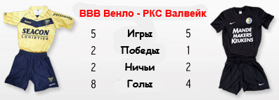 | Статистика встреч: 4-4-3 (16:20) | | Сезон 2012/2013 | | 22.09.2012 РКС Валвейк - ВВВ Венло - 1:1 | | | | Сезон 2011/2012 | | 29.01.2012 РКС Валвейк - ВВВ Венло - 4:0 | | 22.10.2011 ВВВ Венло - РКС Валвейк - 4:1 | | | | Сезон 2009/2010 | | 02.05.2010 РКС Валвейк - ВВВ Венло - 1:2 | | 12.12.2009 ВВВ Венло - РКС Валвейк - 3:0 | |