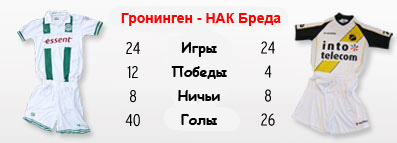 На данный момент эти команды находятся примерно в равной форме, а значит и шансы на успех в личном противостоянии имеют равные. "Гронинген" во второй части чемпионата поправил своё турнирное положение и сейчас идёт в середине, опережая своего сегодняшнего соперника на два очка. В активе "северян" в 2013 году три победы, но при этом четыре поражения. В прошлом туре команда Масканта провалилась в поединке с "Родой", уступив с крупным счётом. "Бреда" же начала вторую часть чемпионата с блестящей трёхматчевой победной серии, причём ни в одном из этих матчей не пропустила. Однако затем "крысы" вернулись к привычному состоянию, а именно пошли чередовать поражение с ничьей и победой. Впрочем, поражение от "Херенвена" в прошлом туре можно отнести к разряду неудачных. НАК доминировал на протяжении всего матча. Только Люрлинг в первом тайме мог оформлять "хет-трик", но мяч ни в какую не летел в сетку. Своего "крысы" добились, но потом расслабились так, что позволили Финнбогасону оформить дубль, а ведь ещё и пенальти кипер "Бреды" отразил. Отметим, что в противостояниях с "Гронингеном" - НАК уже давненько не побеждал. В первом круге было минимальное поражение, в прошлом году в обоих матчах зафиксирована ничья, а ещё год назад "Бреда" дважды уступила. И только в сезоне 2009-10 НАК праздновал свою последнюю до сих пор победу на "северянами". Команды подходят к матчу с равными шансами на успех, а потому рискнём предположить, что будет ничья.