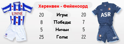 | Статистика встреч: 9-12-20 (52:77) | | Сезон 2012/2013 | | 18.08.2012 Фейеноорд - Херенвен - 1:1 | | | | Сезон 2011/2012 | | 06.05.2012 Херенвен - Фейеноорд - 2:3 | | 28.08.2011 Фейеноорд - Херенвен - 2:2 | | | | Сезон 2010/2011 | | 06.03.2011 Херенвен - Фейеноорд - 0:1 | | 14.11.2010 Фейеноорд - Херенвен - 2:2 | | | | Сезон 2009/2010 | | 02.05.2010 Фейеноорд - Херенвен - 6:2 | | 12.12.2009 Херенвен - Фейеноорд - 0:2 | | | | Сезон 2008/2009 | | 16.01.2009 Херенвен - Фейеноорд - 3:1 | | 26.10.2008 Фейеноорд - Херенвен - 2:2 | | | | Сезон 2007/2008 | | 30.12.2007 Херенвен - Фейеноорд - 1:1 | | 29.09.2007 Фейеноорд - Херенвен - 2:0 | | | | Сезон 2006/2007 | | 29.04.2007 Херенвен - Фейеноорд - 5:1 | | 03.12.2006 Фейеноорд - Херенвен - 4:3 | |