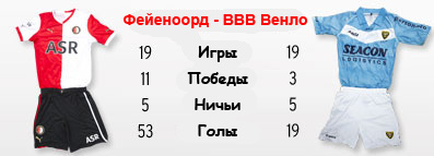 | Статистика встреч: 14-13-12 (74:54) | | Сезон 2012/2013 | | 21.10.2012 ВВВ Венло - Фейеноорд - 2:3 | | | | Сезон 2011/2012 | | 22.01.2012 ВВВ Венло - Фейеноорд - 2:1 | | 16.10.2011 Фейеноорд - ВВВ Венло - 4:0 | | | | Сезон 2010/2011 | | 01.05.2011 ВВВ Венло - Фейеноорд - 3:2 | | 27.10.2010 Фейеноорд - ВВВ Венло - 3:0 | | | | Сезон 2009/2010 | | 24.01.2010 ВВВ Венло - Фейеноорд - 1:1 | | 24.10.2009 Фейеноорд - ВВВ Венло - 1:0 | | | | Сезон 2007/2008 | | 15.03.2008 Фейеноорд - ВВВ Венло - 4:1 | | 09.12.2007 ВВВ Венло - Фейеноорд - 0:0 | |