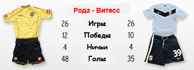 | Статистика встреч: 19-13-21 (82:85) | | Сезон 2012/2013 | | 02.12.2012 Витесс - Рода - 3:0 | | | | Сезон 2011/2012 | | 24.03.2012 Рода - Витесс - 3:1 | | 17.09.2011 Витесс - Рода - 5:0 | | | | Сезон 2010/2011 | | 29.01.2011 Витесс - Рода - 5:2 | | 17.10.2010 Рода - Витесс - 4:1 | | | | Сезон 2009/2010 | | 18.04.2010 Витесс - Рода - 2:5 | | 28.08.2009 Рода - Витесс - 3:4 | | | | Сезон 2008/2009 | | 20.02.2009 Витесс - Рода - 3:0 | | 06.12.2008 Рода - Витесс - 3:0 | | | | Сезон 2007/2008 | | 23.02.2008 Витесс - Рода - 1:1 | | 01.12.2007 Рода - Витесс - 3:2 | | | | Сезон 2006/2007 | | 17.02.2007 Витесс - Рода - 0:0 | | 16.12.2006 Рода - Витесс - 2:4 | |