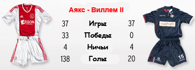 | АЯКС - ВИЛЛЕМ II | 5 мая. Тилбург. Стадион "Виллем II". 14:30. Судья - Данни Маккели (Дордрехт). | | | "Аякс" может за тур до окончания регулярного чемпионата оформить третье кряду чемпионство, если на родной "Амстердам Арене", где 15 мая будет сыгран финал Лиги Европы, обыграет "Виллем". В победе подопечных де Бура практически никто не сомневается, да в этом и нет никаких предпосылок. Своё поле, игра за чемпионство против главного аутсайдера... Вот, пожалуй, главные критерии сегодняшней победы "Аякса". Плюс ко всему у тилбуржцев переполнен лазарет, в свете чего рассчитывать на какой-либо успех в предстоящем матче было бы слишком самонадеянно. Вполне естественно, что все внимание поклонников голландского футбола будет приковано именно к матчу в столице. Интересно получается, ведь помимо того, что "Аякс" сегодня оформит чемпионский титул, он ещё и официально отправит "Виллем" в низший дивизион. Вот так вот всё совпало... Ко всему прочему, сегодня "аяксиды" могут продлить свою беспроигрышную серию, которая уже насчитывает 12 матчей кряду. В первом круге столичная команда добилась выездной победы со счётом 4:2 и тогда, кстати, тилбуржцам на какое-то мгновение удалось даже переломить ход матча, отыграв преимущество "Аякса" в два мяча. Посмотрим, что будет сегодня.