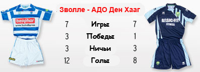 | Статистика встреч: 4-7-4 (21:20) | | Сезон 2012/2013 | | 08.12.2012 АДО Ден Хааг - Зволле - 1:1 | | | | Сезон 2003/2004 | | 26.03.2004 АДО Ден Хааг - Зволле - 1:1 | | 19.10.2003 Зволле - АДО Ден Хааг - 1:2 | |