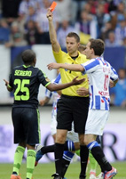Удаление Сереро Вторым по вывеске матчем тура можно было назвать противостояние "Херенвена" и "Аякса". По прошлому году поединок с участием этих команд носил более весомый статус, на данный же момент "Херенвен" является блеклой тенью себя прошлогоднего. Оно и понятно, команду покинули лидеры и сменился главный тренер. В этом-то и есть подоплёка, поскольку "фризов" в межсезонье возглавил экс-игрок "Аякса" Марко ван Бастен. Пока что у рулевого "Херенвена" не всё получается и даже назревал конфликт с руководством, мол мало денег было выделено на трансферы, но вроде бы всё устаканилось, по крайней мере на люди эту ситуацию выносить руководство не собирается. Противостояние бывшей звезды амстердамцев со своей командой - это очень интересно. Главным образом в этом матче сыграл мотивационный фактор. Ван Бастен хорошо подготовил свою команду к матчу с "аяксидами", впрочем и отступать уже не куда, поскольку в трёх предыдущих турах было набрано всего два очка. Что называется, ни в какие ворота. Стартовыми составами наставники не удивили. Де Бур, несмотря на уже выздоровевшего Сулеймани, снова отправил на правый фланг Тобиаса Сана, заслужившего место в основе несколькими голами на старте сезона. Ушедшего ван дер Виля ожидаемо заменил на фланге защиты ван Рейн. Вышел также с первых минут и Сереро, отлично проявивший себя на позиции в центре поля. Как раз Тюлани и открыл счет в матче, классно пробив с ходу с линии штрафной после скидки Шоне. По первым минутам матча, и не только из-за раннего гола, преимущество "Аякса" казалось неоспоримым, тогда как перспективы хозяев - туманными. Однако постепенно "Фризы" увеличили темп, и моменты у ворот Вермера стали возникать с завидной регулярностью. Началось, правда, все, с глупейшей ошибки арбитра. Главному привиделось, что Алдервейрелд сыграл рукой в своей штрафной, тогда как Тоби мяч попал точно в лицо, а лайнсмен его в этой ошибке не поправил. Тем не менее, справедливость восторжествовала спустя минуту, когда Джуричич с пенальти запустил мяч на трибуну. На этом "Фризы" не остановились, вскоре организовав еще одну очень опасную атаку на ворота Вермера, которую запорол Финнбогасон, завалившись на газон после прострела Джуричича. "Аякс" также времени не терял, однако амстердамцам катастрофически не везло. Сначала Сереро, выскочив один на один, пробил в штангу, а уже после неудачного пенальти Джуричича в перекладину выстрелил де Йонг с прострела все того же Сереро. То есть, минимальное преимущество всё-таки было на стороне чемпионов страны, хотя в целом игра смотрелась довольно равной. И все же, ответный гол "Херенвена" стал немного нелогичным как раз по ситуации, в которой он возник. "Привез" его привычно нестабильный Вермер. Кеннет, приняв передачу от защитника на линии штрафной, попросту отдал круглого на ногу Финнбогасону, который спокойно обошел кипера и закатил снаряд в пустые ворота. Ну всю вину скидывать на голкипера не стоит, поскольку передача от ван Рейна действительно была неудобной. Ещё один блестящий шанс забить у амстердамцев запорол Дерк Бурригтер, который пока очевидно не набрал оптимальных кондиций. Выйдя на рандеву с голкипером вингер не сумел его переиграть. "Херенвен", выдержав паузу, классно подловил амстердамцев на контратаке в конце тайма и забил второй гол, тем самым выйдя вперёд. Марече
