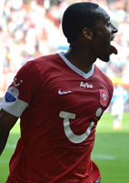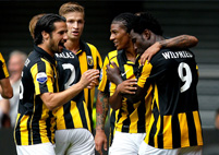 Лерой Фер Совершенно неожиданно, практически на ровном месте, возникли трудности у "Твенте" в домашнем матче против аутсайдера "Венло". Впрочем, такое развитие событий оправдано, поскольку на неделе энсхедцы провели очень трудный матч с турецким "Бурсаспором", который длился не 90 минут, а все 120. "Твенте", хоть и доминировал в центре поля, однако атаковал не так остро, как уже привыкли видеть. К тому же, энсхедцы вполне могли и пропустить, если бы только Линссен смог попасть в ворота головой метров с восьми. Свой первый удар по воротам футболисты "Твенте" нанесли только на 38-й минуте матча. Мяч прошёл рядом со штангой после удара Брамы. Чуть позже не повезло Феру, который немного промахнулся, замыкая навес Булыкина. После перерыва тягомотная игра со стороны тех и других продолжилась. "Венло" явно не хватало класса исполнителей, а энсхедцы действительно устали после игры на неделе. Самым активным у ВВВ, как впрочем и всегда, был Янник Вилдсхут, но даже ему не везло в самый ответственный момент. "Твенте" во втором тайме имел как минимум два стопроцентных момента. Вначале Висгерхоф умело отыграл двоих оппонентов и бил наверняка в ближний угол, но Мейнпа выстрел этот потащил, а затем уже и кипер не смог помочь своей команды, а в игру вмешалась перекладина, после убойного удара Роберта Схилдера. Перед самым финальным свистком удача "Твенте" всё-таки улыбнулась. Макларен сделал удачные замена, выпустив на поле двух игроков из молодёжного состава, один из которых - Борн - заработал одиннадцатиметровый. Назначенный в ворота гостей пенальти четко реализовал Фер, добыв для своей команды тяжелейшую победу, которая позволила "Твенте" сохранить единоличное лидерство в таблице с максимальным числом очков.
