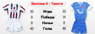 | Статистика встреч: 13-18-41 (75:138) | | Сезон 2010/2011 | | 01.05.2011 Твенте - Виллем II - 4:0 | | 27.10.2010 Виллем II - Твенте - 1:3 | | | | Сезон 2009/2010 | | 21.02.2010 Твенте - Виллем II - 1:0 | | 28.11.2009 Виллем II - Твенте - 1:3 | | | | Сезон 2008/2009 | | 14.03.2009 Виллем II - Твенте - 0:2 | | 21.12.2008 Твенте - Виллем II - 2:0 | | | | Сезон 2007/2008 | | 20.04.2008 Твенте - Виллем II - 2:0 | | 16.09.2007 Виллем II - Твенте - 1:3 | | | | Сезон 2006/2007 | | 24.02.2007 Твенте - Виллем II - 0:0 | | 10.12.2006 Виллем II - Твенте - 1:3 | |
