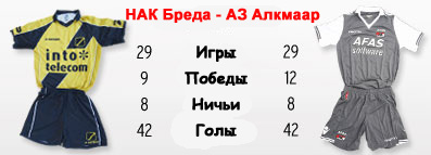 АЗ забивал в ворота "Бреды" минимум по одному голу за игру в последних девяти выездных матчей, при этом алкмаарцы шесть матчей не могут победить на выезде. Подопечные Гертьяна Вербеека уже вылетели из еврокубков, а потому полностью сосредоточены на чемпионате. В прошлом туре этот факт был подтверждён, под раздачу попала "Рода", уехавшая из Алкмаара с двумя баранками - с нулём очков и забитых мячей. АЗ вряд ли ждёт спад в ближайшее время, именно потому, что команда уже не играет на два фронта. Соперник в лице "Бреды", по воротам которой бьют чаще всего в этом сезоне: за пять матчей было нанесено 92 удара, вряд ли может считаться серьёзным. Даже не смотря на фактор своего поля, НАК не должен стать препятствием для команды Вербеека. АЗ необходимо побеждать ещё и по турнирному положения. В данный момент коллектив из Алкмаара занимает место в середине таблицы, что не может радовать. НАК за первые пять туров набрал всего лишь два очка и пока не имеет в активе побед. При этом команда Карелса уже сыграла с двумя грандами - "Аяксом" и "Твенте" - в обоих матчах были сухие поражения.