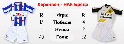 "Херенвен" в этом сезоне ещё ни разу не почувствовал вкуса победы. От той прекрасной команды "Херенвен", которая билась с грандами в прошлом сезоне, остались только воспоминания. Сейчас ситуация в команде иная. "Фризы" идут в зоне вылета, с новым тренером и практически новым подбором игроков. Пока что Марко ван Бастен пользуется доверием руководства клуба. На неделе это доверие было подкреплено крупной победой в Кубке Голландии, пусть и над малоизвестной командой. Отметим, что в том матче "хет-трик" на свой счёт записал исландец Финнбогасон. НАК, в свою очередь, до прошлого тура тоже не имел ни одной победы в активе, однако три очка в матче с АЗ Алкмааром стал неожиданностью. Правда, не будем забывать, что на на прошлой неделе "крысы" отмечали столетие клуба, а потому не имели права проигрывать, даже "Алкмаару". "Бреда" на неделе также играла в Кубке и тоже победила. Со счётом 3:1 был обыгран МВВ Маастрихт.