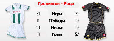 Противостояние севера и юга состоится на "Еуроборге". Хозяева потихоньку набирают обороты. После крупного поражения от "Витесса", "северяне" обыграли "Зволле", а на неделе прошли в следующий этап Кубка Голландии. Хорошие шансы у команды Роберта Маасканта, чтобы завоевать три очка и в этом матче. "Рода" сейчас находится, мягко говоря, не в лучшем состоянии. Отсутствие основного форварда керкрадцев Сенхариба Малки сказалось на двух последних матчах. Уже три матча кряду команда Бруда терпит сухие поражения. Вначале "Роду" опустил АЗ (4:0), затем последовало поражение от "Утрехта" в родных пенатах, а на неделе "Гордость Юга" вылетела из национального Кубка, проиграв новичку элиты - "Зволле". Пока что работа Бруда вызывает доверие у руководство. Исправлять ситуацию необходимо здесь и сейчас, а то нынешнее положение дел ужасно. Если бы не ряд других, более слабых команд, то "Рода" сейчас бы находилась в зоне вылета. В прошлом сезоне керкрадцы в обоих матчах праздновали успех. Как будет на этот раз?