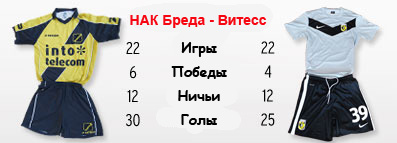| НАК БРЕДА - ВИТЕСС | 20 октября. Бреда. Стадион "Рат Верлех". 21:45. Судья - Данни Маккели (Дордрехт). | | | "Бреде" в этом сезоне явно не хватает глубины состава, да и игрока, который бы повёл всю команду. Хотя по именам вроде бы такие имеются. Например, тот же ветеран Люрлинг. Сейчас НАК идёт в зоне вылета, имея в активе лишь одну победу над АЗ, и то, которая была добыта вовремя празднования клуба 100-летия. В прошлых двух турах были поражения с общим счётом 6:0, от ПСВ и "Херенвена" соответственно. "Витесс" же напротив, в этом сезоне выступает очень хорошо и не имеет пока что поражений, наряду с "Аяксом". Команда, которую летом возглавил Фред Рюттен, демонстрирует хороший футбол, а их лидер атаки Вилфрид Бони забивает от матча к матчу. Плюс есть хорошее приобретение в центр поля, в лице Тео Янссена. Кто-кто, а "Витесс" наоборот может похвастаться глубиной состава и выбор у Рюттена огромный. Арнемцы безусловный фаворит матча, но кто знает, может именно неудачной "Бреде" суждено нанести команде Рюттена первое поражение в сезоне, ведь когда-то это должно произойти.