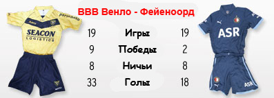 У "Фейеноорда" есть хороший шанс догнать в турнирной таблице амстердамский "Аякс" и команда Рональда Кумана должна этим воспользоваться, тем более сыграть предстоит с одним из аутсайдеров. Правда наставник роттердамцев не сможет рассчитывать на целый ряд основных игроков. В их числе и кипер Мюлдер, которого продолжает заменять Лампру, а также защитники Де Врей и Конголо, последний дисквалифицирован. Ко всему прочему в этот список добавились и "крылья" атаки "Фейе" - Секу Сиссе и Рубен Схакен. Последний получил травму в матче за сборную Голландии, дебют в которой получился на славу. В одном из матчей Схакен забил гол. А вот против своей бывшей команды, речь о "Венло", сыграть он не сможет. ВВВ замыкает турнирную таблицу имея в активе три очка и ни одной победы. Это единственная команда, которая ещё ни разу не побеждала в этом сезоне. Отметим, что последний раз в Венло "Фейеноорд" побеждал в далёком 1991-м году, а последние два сезона на "Де Куле" были исключительно поражения. Защита "Венло" самая пропускающая в Эредивизии (21 гол). Матч против "Венло" может стать дебютным для полузащитника "Фейеноорда" Джона Гуссенса, который перейдя из "Неймегена" пропустил несколько месяцев из-за травмы.