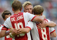 "Аякс" и в нынешнем сезоне Эредивизи является его главным фаворитом. В отчётном туре этот статус подопечные Франка де Бура только подтвердили. Выиграв три предыдущих первенства подряд, столичная команда повторила аналогичное достижение 90-х годов прошлого века, установленное легендарной командой Луи ван Гала. Если в этом сезоне "аяксиды" завоюют титул, то и вовсе войдут в иcторию клуба - ни одному предыдущему поколению четырежды кряду становиться чемпионами не удавалось. "Аякс" уже успел этим летом выиграть один титул. В прошлый уик-энд "красно-белые" на "Амстердам Арене" к 69-й минуте уступали АЗ со счетом 0:2, но до конца основного времени смогли отыграться, а в овертайме гол Сима де Йонга принес им трофей. "Рода" предыдущий сезон провела неудачно и была вынуждена по итогам чемпионата играть переходные матчи, пытаясь сохранить прописку в высшем дивизионе. И едва не потеряла ее! Если в полуфинале "Де Графсхап" пройти удалось весьма уверенно (1:1 и 6:1), то в противостоянии со "Спартой" из Роттердама" до 90-й минуты ответного поединка "Рода" "висела на волоске", но все-таки избежала понижения в классе. Во многом это произошло благодаря полузащитнику керкрадцев Фледдерусу, который дважды забил со стандартов и оставил свою команду в элите голландского футбола. Увы, но помочь своей команде в дебютном матче сезона он не смог из-за дисквалификации. Но это далеко не все потери керкрадцев перед отчётным матчем. Линия атаки была ослаблена отсутствием травмированного Демужа, а лучший бомбардир команды последних лет Сенхариб Малки уже покинул "Гордость Юга", перебравший в турецкий чемпионат. Вот и пришлось Бруду рассчитывать на Кристиана Немета, который своей игрой не впечатлял ещё по прошлому сезону. А ведь пришёл он в "Роду" вместе с наставником из "Валвейка". Также в составе керкрадцев появились и другие новички, но все они никак себя не проявили. Изменился состав и у "Аякса", по сравнению с матчем за Суперкубок. Франка де Бура явно не впечатлил Лассе Шёне, который, в результате, остался в запасе, а его место в опорной зоне занял Кристиан Поульсен. Как не странно, но первый удар по воротам нанесли гости. Новичок и капитан команды Ард ван Пеппен отдал хорошую передачу как раз на Немета, но венгр из хорошей позиции пробил точно в руки Вермеру. Подобных просчётов в дальнейшем "Аякс" не совершал. Прибрав мяч к своим рукам подопечные Де Бура начали расшатывать оборонительные порядки соперника. Так, уже на 4-й минуте удалось заработать штрафной удар почти на линии штрафной площади, который исполнил Эриксен. Мяч после удара датчанина скользнул по голове защитника и попал в перекладину. Ждать гола, в результате, долго не пришлось. Следующий же штрафной "аяксиды" воплотили во взятие ворот. Вновь Эриксен, но на этот раз хитрая подача в штрафную, рикошет от газона прямо перед кипером, который отбил снаряд точно на ногу набегавшего Рикардо ван Рейна - 1:0. Увеличить счёт команде Франка де Бура удалось на исходе получаса. Снова решающую роль сыграл Кристиан Эриксен, который как на блюдечке выдал мяч Симу де Йонгу, а капитан амстердамцев легко переиграл Курто. Несмотря на столь существенную роль в забитых мячах, нельзя сказать, что Эриксен провёл выдающийся матч. Датчанин явно не играл на сто процентов своих возможностей. Возможно в голове до сих пор стоит выбор уходить или 