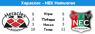 Этот матч представителей низов таблицы интересен, прежде всего, тем, что может стать отправной точкой "Неймегена" на пути в спасительную зону. После увольнения Алекса Пастора игроки команды поняли, что умеют играть в футбол, и на протяжении четырех игр кряду сражаются до последнего, находясь при этом в невероятной близости от успеха. В то же время у "Хераклеса" есть возможность порадовать своих болельщиков долгожданной победой. Последний раз такое событие в Альмело случалось ещё в августе. "Неймеген" же остаётся единственным коллективом, который не одержал пока ни одной победы в нынешнем сезоне. В случае успеха НЕК покинет последнюю строчку, ведь "Валвейк" вчера потерпел очередное поражение и может опуститься на самое дно. Предпосылки к успеху гостей есть, в первую очередь это желание. Но, всё-таки, поставим на ничейный исход в этом противостоянии.