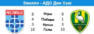 Несмотря на серию неудачных матчей, "Зволле" продолжает на расстоянии вытянутой руки удерживаться от первого места. Вернуть его уже не удастся, но вот не выпасть из зоны еврокубков вполне по силам команде Рона Янса, которая не знает радости побед в Эре уже на протяжении пяти туров. Однако обыграть жутко нестабильный "Ден Хааг" реально, к тому же, он также испытывает определенные кадровые трудности. В этом матче ключевую роль может сыграть фактор своего поля. К тому же за гаагцев не сыграет ключевой игрок середины поля Данни Холла. Фаворитом на бумаге выглядят, безусловно, хозяева и другого результата, кроме победы, болельщики вряд ли воспримут положительно. Пора уже прерывать затянувшуюся серию неудач. "Ден Хааг", кстати, без игрового тонуса находится на неделю больше, помимо сборных, коллектив Мориса Стейна не играл и в матче прошлого тура. Причина всё та же, ужасное состояние газона на собственном поле.