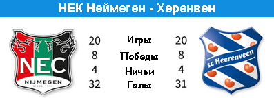 | Статистика встреч: 13-8-21 (60:79) | | Сезон 2012/2013 | | 16.03.2013 НЕК Неймеген - Херенвен - 1:3 | | 12.08.2012 Херенвен - НЕК Неймеген - 0:2 | | | | Сезон 2011/2012 | | 14.04.2012 НЕК Неймеген - Херенвен - 2:4 | | 06.08.2011 Херенвен - НЕК Неймеген - 2:2 | | | | Сезон 2010/2011 | | 05.02.2011 Херенвен - НЕК Неймеген - 0:0 | | 28.08.2010 НЕК Неймеген - Херенвен - 2:2 | | | | Сезон 2009/2010 | | 19.03.2010 Херенвен - НЕК Неймеген - 4:1 | | 07.08.2009 НЕК Неймеген - Херенвен - 4:1 | |