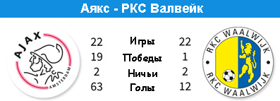| Статистика встреч: 33-9-2 (113:31) | | Сезон 2012/2013 | | 17.02.2013 РКС Валвейк - Аякс - 0:2 | | 15.09.2012 Аякс - РКС Валвейк - 2:0 | | | | Сезон 2011/2012 | | 11.03.2012 Аякс - РКС Валвейк - 3:0 | | 11.12.2011 РКС Валвейк - Аякс - 0:1 | | | | Сезон 2009/2010 | | 21.03.2010 РКС Валвейк - Аякс - 1:5 | | 08.08.2009 Аякс - РКС Валвейк - 4:1 | |