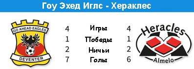 | Статистика встреч: 2-4-2 (14:8) | | Сезон 1985/1986 | | 15.12.1985 Гоу Эхед Иглс - Хераклес - 2:2 | | 18.08.1985 Хераклес - Гоу Эхед Иглс - 1:0 | | | | Сезон 1965/1966 | | 24.04.1966 Гоу Эхед Иглс - Хераклес - 2:0 | | 10.03.1966 Хераклес - Гоу Эхед Иглс - 0:0 | |