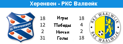 | Статистика встреч: 20-9-7 (57:37) | | Сезон 2012/2013 | | 01.02.2013 РКС Валвейк - Херенвен - 0:1 | | 17.11.2012 Херенвен - РКС Валвейк - 0:2 | | | | Сезон 2010/2011 | | 12.02.2012 РКС Валвейк - Херенвен - 0:1 | | 19.11.2011 Херенвен - РКС Валвейк - 1:1 | | | | Сезон 2009/2010 | | 20.02.2010 РКС Валвейк - Херенвен - 1:2 | | 28.11.2009 Херенвен - РКС Валвейк - 3:1 | |