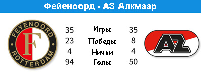 | Статистика встреч: 38-17-17 (156:92) | | Сезон 2012/2013 | | 10.02.2013 Фейеноорд - АЗ Алкмаар - 3:1 | | 25.11.2012 АЗ Алкмаар - Фейеноорд - 0:2 | | | | Сезон 2011/2012 | | 29.04.2012 Фейеноорд - АЗ Алкмаар - 1:0 | | 25.09.2011 АЗ Алкмаар - Фейеноорд - 2:1 | | | | Сезон 2010/2011 | | 02.04.2011 Фейеноорд - АЗ Алкмаар - 0:1 | | 31.10.2010 АЗ Алкмаар - Фейеноорд - 2:1 | | | | Сезон 2009/2010 | | 07.02.2010 Фейеноорд - АЗ Алкмаар - 1:2 | | 08.11.2009 АЗ Алкмаар - Фейеноорд - 1:1 | |