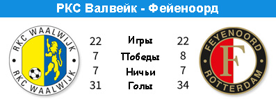 | Статистика встреч: 8-13-23 (44:82) | | Сезон 2012/2013 | | 14.04.2013 РКС Валвейк - Фейеноорд - 1:1 | | 01.12.2012 Фейеноорд - РКС Валвейк - 2:0 | | | | Сезон 2011/2012 | | 18.02.2012 Фейеноорд - РКС Валвейк - 1:1 | | 27.11.2011 РКС Валвейк - Фейеноорд - 1:2 | | | | Сезон 2009/2010 | | 04.02.2010 РКС Валвейк - Фейеноорд - 0:1 | | 03.10.2009 Фейеноорд - РКС Валвейк - 3:0 | |