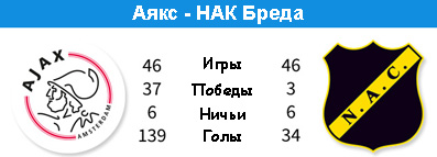 | Статистика встреч: 69-14-9 (235:74) | | Сезон 2012/2013 | | 27.04.2013 НАК Бреда - Аякс - 0:2 | | 25.08.2012 Аякс - НАК Бреда - 5:0 | | | | Сезон 2011/2012 | | 11.02.2012 НАК Бреда - Аякс - 0:2 | | 19.11.2011 Аякс - НАК Бреда - 2:2 | | | | Сезон 2010/2011 | | 30.01.2011 НАК Бреда - Аякс - 0:3 | | 16.10.2010 Аякс - НАК Бреда - 3:0 | | | | Сезон 2009/2010 | | 17.01.2010 НАК Бреда - Аякс - 1:1 | | 13.09.2009 Аякс - НАК Бреда - 6:0 | |