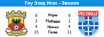 "Гоу Эхед Иглс" дома особенно опасен, а "Зволле" остается с одной победой в последних 11-ти матчах. А как всё прекрасно начинало для команды Рона Янса, которая всех удивляла всех своей красочной игрой и результатами и даже шла в лидерах. Увы, но сейчас "Зволле" только девятый и ведёт борьбу в середине турнирной таблицы. "Гоу Эхед Иглс" отстаёт от сегодняшнего соперника на пять очков, так что даже в случае успеха "Орлам" будет не достать "синих пальцев", зато можно сократить отставание. Любопытно, что "Зволле" в последних матчах играет исключительно вничью. Сначала с ПСВ, затем с "Твенте", а в последних двух турах с "Гронингеном" и "Валвейком". "Гоу Эхед Иглс" последний тур также завершил результативной ничьей, а последняя победа была добыта в начале ноября, когда с крупным счётом "Орлы" переиграли "Роду" на её поле. Главной потерей хозяев является капитан команды Колдер, у гостей же, напротив, лазарет чуточку опустел.