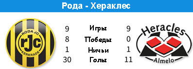 В заключительном матче тура сыграют представители нижней части таблицы, которых разделяет три балла. Именно на столько "Рода" опережает своего сегодняшнего оппонента. И та, и другая команда в последних четырёх турах не могут одержать побед. Керкрады чередуют ничьи с поражениями, набрав за этот отрезок два очка, а у "Хераклеса" и того всего один балл, заработанный в матче прошлого тура с "Гоу Эхед Иглс". Таким образом, альмельцы сумели прервать трёхматчевую серию поражений. Любопытно, что последние победы этих команд были с грандами голландского футбола. "Рода" обыграла ПСВ, а "Хераклес" - "Фейеноорд", причём с одинаковым счётом 2:1. Отметим также, что в этом сезоне "гераклы" играют не свойственно для себя. Обычно этот коллектив является домашним, но в этом сезоне в родных стенах была добыта всего одна победа и всего пять очков, в то время как в выездных поединках "Хераклес" набрал в два раза больше и уступает по статистике гостевых матчей лишь "Твенте" и "Витессу".
