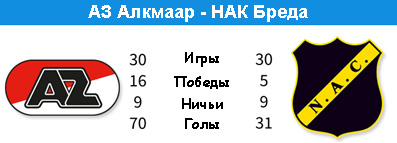 Совершенно не важно, в какой форме находятся обе команды - усложнить себе жизнь в матчах с "Бредой" футболисты АЗ считают за долг в любом случае. За последней победой "сыроваров" над южанами придется отправиться аж в 2007-й год, когда "Бреда" возвращалась из Алкмаара ободранная до костей (6:0). Однако то поражение является скорее исключением из правил, нежели закономерностью. В последнее время матчи между "крысами" и АЗ проходят под диктовку первых, как было, к примеру, в первом круге текущего сезона – 3:0. Команда Дика Адвокаата в последних 6-ти матчах взяла всего 2 очка, что само по себе настораживает и подразумевает продолжение грустной традиции. Проблемы в АЗ также могут возникнуть и с уровнем мотивации форварда Арона Йоханссона, которому по-прежнему снится АПЛ. Не будем забывать, что команду покинут и Мартен Мартенс, перебравшийся в греческий ПАОК. После резвого начала под руководством Адвоката последовал спуск вниз. Последний раз алкмаарцы побеждали в ноябре прошлого года, с тех пор дважды сыграв вничью и четырежды уступив своим оппонентам. "Бреда" же сумела завершить прошлый год победой, пусть и минимальной.