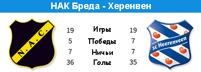 | Статистика встреч: 9-10-21 (60:81) | | Сезон 2012/2013 | | 02.03.2013 НАК Бреда - Херенвен - 1:2 | | 29.09.2012 Херенвен - НАК Бреда - 2:0 | | | | Сезон 2011/2012 | | 17.02.2012 Херенвен - НАК Бреда - 1:0 | | 26.11.2011 НАК Бреда - Херенвен - 2:2 | | | | Сезон 2010/2011 | | 13.02.2011 НАК Бреда - Херенвен - 0:2 | | 21.08.2010 Херенвен - НАК Бреда - 3:1 | | | | Сезон 2009/2010 | | 18.04.2010 Херенвен - НАК Бреда - 0:0 | | 30.08.2009 НАК Бреда - Херенвен - 2:0 | |