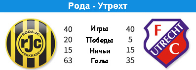 | Статистика встреч: 35-25-39 (133:153) | | Сезон 2013/2014 | | 28.09.2013 Утрехт - Рода - 3:3 | | | | Сезон 2012/2013 | | 24.02.2013 Утрехт - Рода - 4:0 | | 21.09.2012 Рода - Утрехт - 0:1 | | | | Сезон 2011/2012 | | 06.05.2012 Рода - Утрехт - 1:3 | | 27.08.2011 Утрехт - Рода - 3:1 | | | | Сезон 2010/2011 | | 06.03.2011 Утрехт - Рода - 1:1 | | 24.11.2010 Рода - Утрехт - 1:1 | | | | Сезон 2009/2010 | | 23.01.2010 Рода - Утрехт - 2:0 | | 23.10.2009 Утрехт - Рода - 2:1 | |