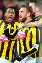 Начнём, по традиции, с центрального матча тура, в котором сразились "Фейеноорд" и "Витесс". Сказать о том, что матч важный - значит ничего не сказать. В случае успеха одна из команд не только получала бы в свою копилку важные три очка, но заодно и добавила проблем своему сопернику. Арнемцы могли выбить роттердамцев из чемпионской гонки, а те, в свою очередь, могли сократить отставание и завязать ещё большую интригу. Увы, но в итоге все остались при своём. Стартовыми составами оба тренера ни кого не удивили. Разве что у роттердамцев была одна вынужденная замена. Травмированного Матейсена в центре обороны заменил Конголо. Ещё одним вариантом было смещение в центр Бруно Мартинса, тогда слева должен был бы появиться Нелом. Однако, Куман предпочёл первый вариант и довольно рисковый, ведь Конголо получает недостаточно игровой практики в этом сезоне, а если быть точнее, то это был четвёртый матч 19-летнего игрока. Здесь, как говорится, тренеру виднее. С первых минут команды боролись за инициативу, а потому зрелищность матча от этого страдала. "Фейеноорд" действовал в привычной манере. Мяч транзитом через фланг доставлялся в штрафную, где партнёры всегда ищут Грациано Пелле. У роттердамцев неплохой матч провёл Боэтиюс, который был едва ли не самым активным, ведь именно с его передачи и открыл счёт Пелле. Капитан "Фейеноорда" конечно же забил в своей манере - ударом головой. В остальном хозяева больше ничем не отметились, как впрочем и гости. Опасным разве что можно назвать удар ван Анхольта, да и выход Леердама, которого всё же успел опередить голкипер. Не менее активен был и правый фланг "Фейеноорда", где бровку "от" и "до" бороздил Янмат. Во втором тайме случился не очень приятный эпизод, когда Бруно Мартинс Инди, то ли специально, то ли случайно, но, так или иначе, ногами прошёлся по Ибарре. Судья эпизода не видел, а потому санкций не последовала. Ибарра конечно был недоволен, однако ответил сопернику иначе, сделав роскошную навесную передачу на 57-й минуте, которую в гол воплотил Кашия. Кстати, именно из под грузина забил Пелле, поэтому можно считать, что капитан "Витесса" реабилитировался. Замены, которые сделали оба наставника, усилили игру в концовке матча. Команды обменялись опасными моментами, в частности едва своей бывшей команде не забил Леердам. А мы по этому сезоне знаем, как любят забивать в добавленное время защитники арнемцев. Увы, но в этот вечер подобного не произошло и команды разыграли ничью.