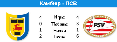 | Статистика встреч: 0-2-7 (2:15) | | Сезон 2013/2014 | | 31.08.2013 ПСВ Эйндховен - Камбюр - 0:0 | | | | Сезон 1999/2000 | | 16.04.2000 ПСВ Эйндховен - Камбюр - 1:0 | | 21.11.1999 Камбюр - ПСВ Эйндховен - 0:1 | | | | Сезон 1998/1999 | | 13.03.1999 ПСВ Эйндховен - Камбюр - 3:0 | | 22.08.1998 Камбюр - ПСВ Эйндховен - 1:1 | |