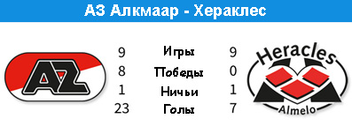 Уступив по всем статьям "Аяксу" в позапрошлом туре со счётом 4:0, АЗ в том же стиле и с тем же счетом разгромил дома "Валвейк". И усталость после матча Лиги Европы не стала помехой команде Дика Адвоката. Алкмаарцы переиграли своего визави по всем статьям, не позволив "католикам" даже думать о возможности отыграться. Четыре мяча в ворота "Валвейка" залетело за час игры, дальше "Сыровары" просто не захотели добивать беднягу, хотя и моменты были в достатке. От алкмаарцев, похоже, никуда не денется место в плей-офф, в котором разыграется последняя путевка в Лигу Европы. К тому же, вскоре им предстоит кубковое противостояние с "Аяксом", в котором будет разыграна путевка в финал. "Хераклес" в привычном темпе стабильно располагается в середине таблицы. В последних четырёх турах альмельцы не сумели победить, сыграв два матча вничью и дважды уступив. В последнем туре поражение было от "Херенвена" в родных стенах. Вот что сказал до матча с АЗ наставник "Хераклеса" Ян де Йонге. "Мы должны продолжать придерживаться своего стиля игры. Я уверен, что мы снова начнем побеждать. У нас есть талантливый нападающий Марк Ут, в которого необходимо верить. Против АЗ нам нужно действовать очень осторожно, особенно в защите, их игроки любят меняться позициями. У АЗ есть футболисты, способные создать моменты на индивидуальном мастерстве, отчасти в этом их сила". Остаётся добавить, что в первом круге альмельцы одержали победу в родных стенах со счётом 2:0.
